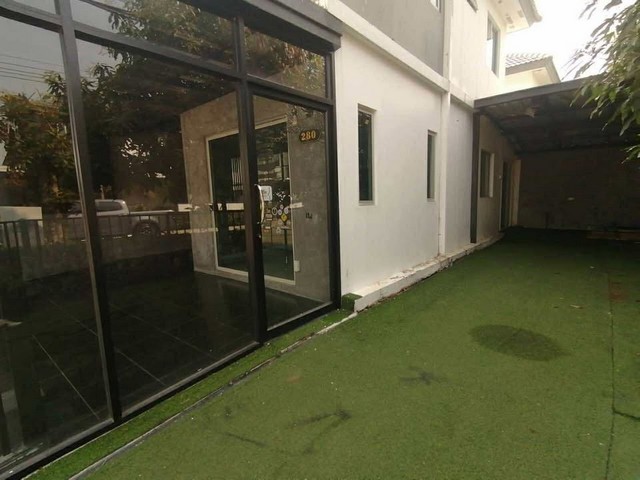 เป็นบ้านหลังมุม ติดถนน 2 ด้าน ต่อเติมหลังคาที่จอดรถ ติดกระจกด้านหน้าบ้าน